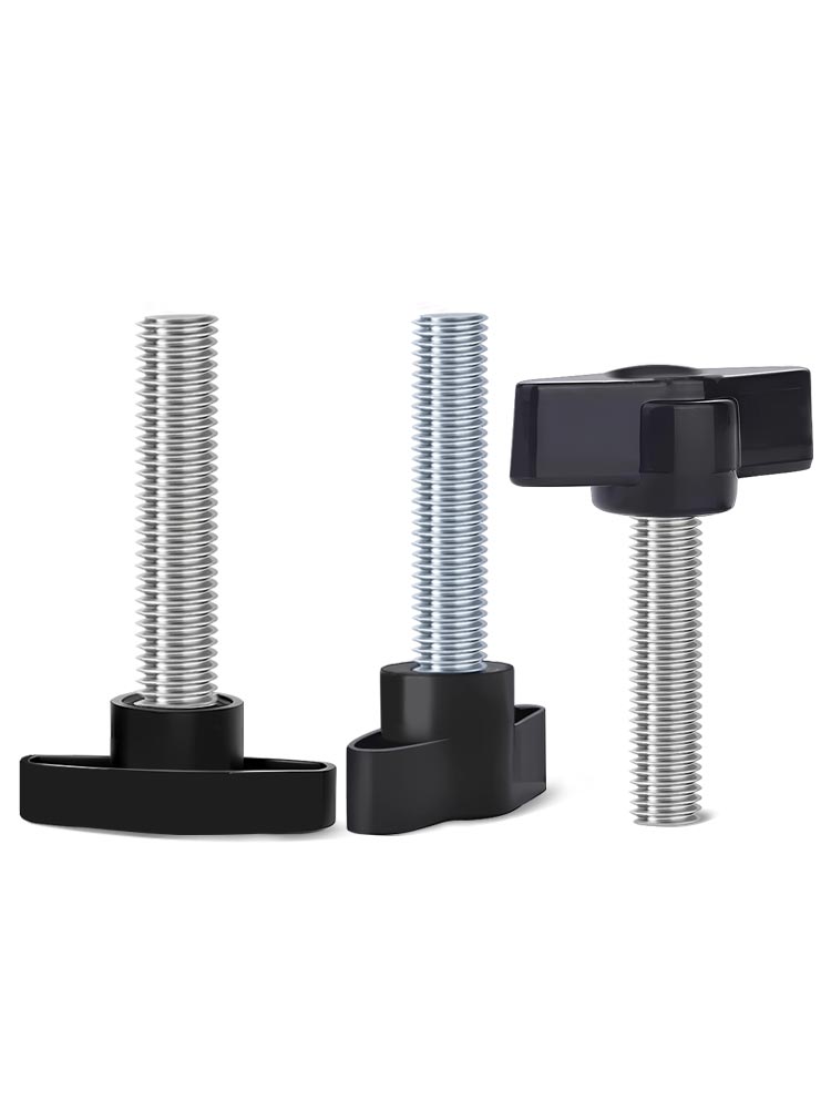The threaded rod is made from quenched-and-tempered alloy steel, delivering tensile strength ≥900 MPa and yield strength ≥750 MPa with a core hardness of 35–42 HRC. It’s finished in black-oxide for moderate corrosion resistance and smooth thread engagement. The T-knob is molded from glass-fiber–reinforced nylon for high impact resistance, dimensional stability, and long service life.