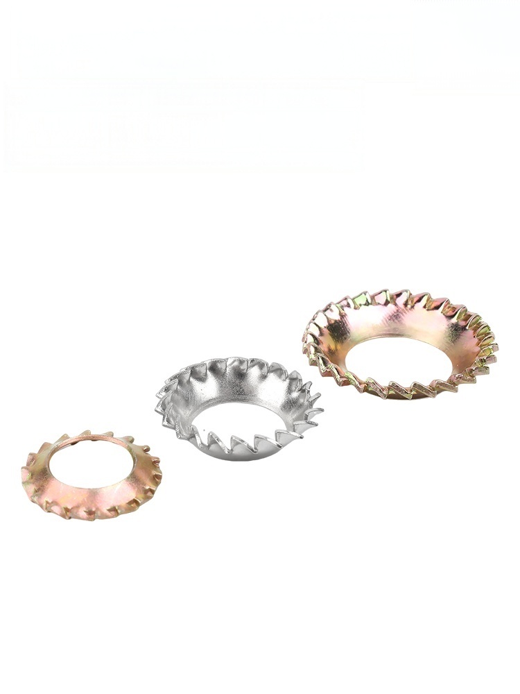 • Precision-stamped from 65 Mn spring steel and tempered to HRC 39-50 (≈ 350–500 HV), the washer’s outward-facing serrations bite simultaneously into the fastener head and joint material, producing prevailing torque that cancels vibration-induced loosening without thread damage.